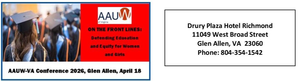 2026 Conference Registration Form AAUW-VA 2026 Pre-Conference/Conference Registration Form Pre-conference activities on Friday, April 17, 2026 Conference on Saturday, April 18, 2026 1. PLEASE FILL IN EACH BLANK:Name* First Last Email:* Preferred name for badge:Branch:Address Street Address Address Line 2 City State / Province / Region ZIP / Postal Code 2. Check all that apply: First Time Attendee AAUW-VA Branch Member Past AAUW-VA State Board President Past AAUW-VA State Board Member Current AAUW-VA Branch President Current AAUW-VA State Board Member Presenter AAUW National Member Non-AAUW Member Other AAUW State Member Student NOTE: All deadlines indicated in this form are the dates by which this registration form and payments must be received. 3. CONFERENCE REGISTRATION PRICE INCLUDES SATURDAY LUNCH AND ALL-DAY DRINKS. CHECK THE APPROPRIATE BOX: Member registration received by March 15 $85 Member registration received by March 16 to March 27 $110 Non-member registration received by March 15 $105 Non-member registration received by March 16 to March 27 $130 Student registration received by March 27 $50 Total $0.00 FINAL REGISTRATION DEADLINE IS March 27, 2026. NO REFUNDS AFTER THIS DATE. 4. LUNCH IS INCLUDED IN THE PRICE OF YOUR REGISTRATION. Please choose only one of the two meal options. Option 1 is a sandwich/wrap and includes a bag of chips and a cookie. Option 2 is a salad and includes a cookie. Check the appropriate boxes below.IF YOU HAVE FOOD ALLERGIES OR SPECIAL DIETARY, PLEASE CONTACT TESS THOME AT THOMETESS@GMAIL.COM.OPTION 1: SANDWICH/WRAP. Comes with lettuce, tomato, cheddar cheese, and condiments. Check one. Turkey Ham Tuna Salad Fajita Vegetable Check one. Wrap Sub Roll OPTION 2: SALAD. Check one. Garden Salad with Roasted Chicken Chef Salad Southwest Salad with no Chicken Check one dressing. Ranch Balsamic 5. GUEST LUNCHES: Your registration fee includes lunch so only pay the cost for a guest lunch if you have a guest coming to lunch. Quantity Price: $25.00 Quantity Guest NamePlease choose only one of the two meal options for your guest. Option 1: a sandwich/wrap, includes a bag of chips and a cookie. Option 2: the salad includes a cookie. Check the appropriate boxes below. IF YOUR GUEST HAS ANY FOOD ALLERGIES OR SPECIAL DIETARY NEEDS, PLEASE CONTACT TESS THOME AT THOMETESS@GMAIL.COM. OPTION 1: SANDWICH/WRAP. Comes with lettuce, tomato, cheddar cheese, and condiments. Check one. Turkey Ham Tuna Salad Fajita Vegetable Check one. Wrap Sub Roll OPTION 2: SALAD. Check one. Garden Salad with Roasted Chicken Chef Salad Southwest Salad with no Chicken Check one dressing. Ranch Balsamic 6. ACCESSIBILITY NEEDS: Please be specific. 7. OPTIONAL PRE-CONFERENCE ACTIVITIES ON FRIDAY, APRIL 17, 2026. CHECK ALL THAT APPLY: TOURS (Do not select more than one tour because they are offered concurrently. Advance payment is required for tours where a cost is stated.) All tours will leave the hotel at 1:30 pm for 2:00 pm start times at locations. You will be returned to the hotel no later than 4:30 pm. Transportation will be provided. Capitol Tour – no cost but limit of 10 people Virginia Museum of History and Culture – limit 10 people Regular admission $15 65 and older admission $13 Free to members – must have your card Black History Museum & Cultural Center of Virginia– limit 10 people Regular admission $10 65 and older admission $8 Total $0.00 Friday Evening Social I plan to attend this. Final conference total $ INSTRUCTIONS: If you have questions or need additional information, please contact: Theresa Merkel at theresa.merkel@comcast.net or (540-664-1266) or Marsha Gochenour at mgochen@yahoo.com or (540-533-8069) or Pat Kadel at patriciakadel52@gmail.com or (717-314-4470) Looking forward to enjoying the conference with you in Glen Allen on April 17 - 18, 2026.Payment MethodPayPal Checkout MasterCardVisaSupported Credit Cards: MasterCard, Visa Card Number Expiration Date Security Code Cardholder Name Δ